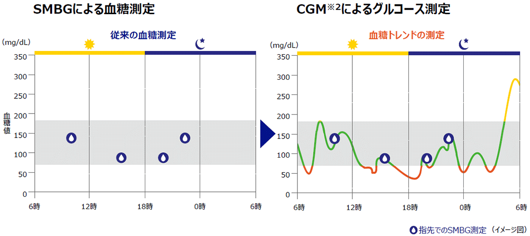 SMBGによる⾎糖測定は、測定時の値はわかりますがその間のトレンドがわからないため、⼗分な⾎糖管理の達成が困難な場合があります。
