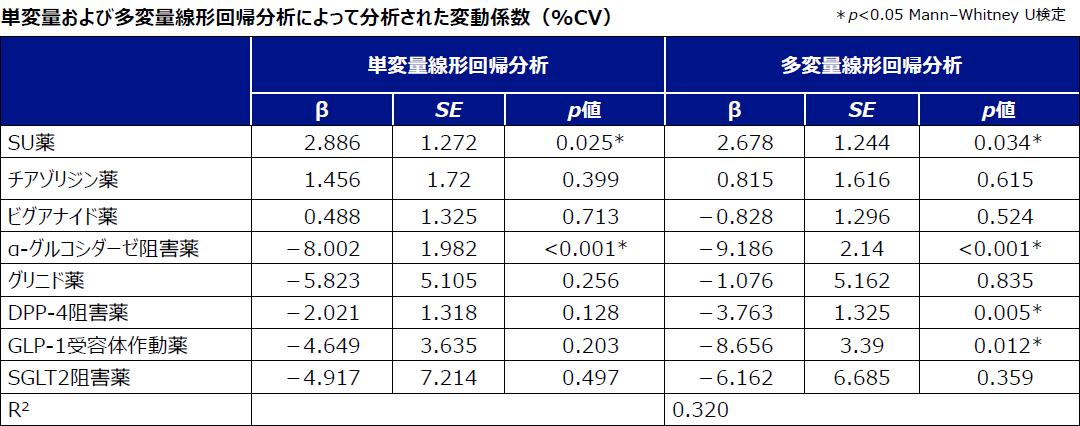 SU薬投与は、グルコース変動の差に影響を及ぼす重要な因⼦として特定されました(β: 2.678, p=0.034)。